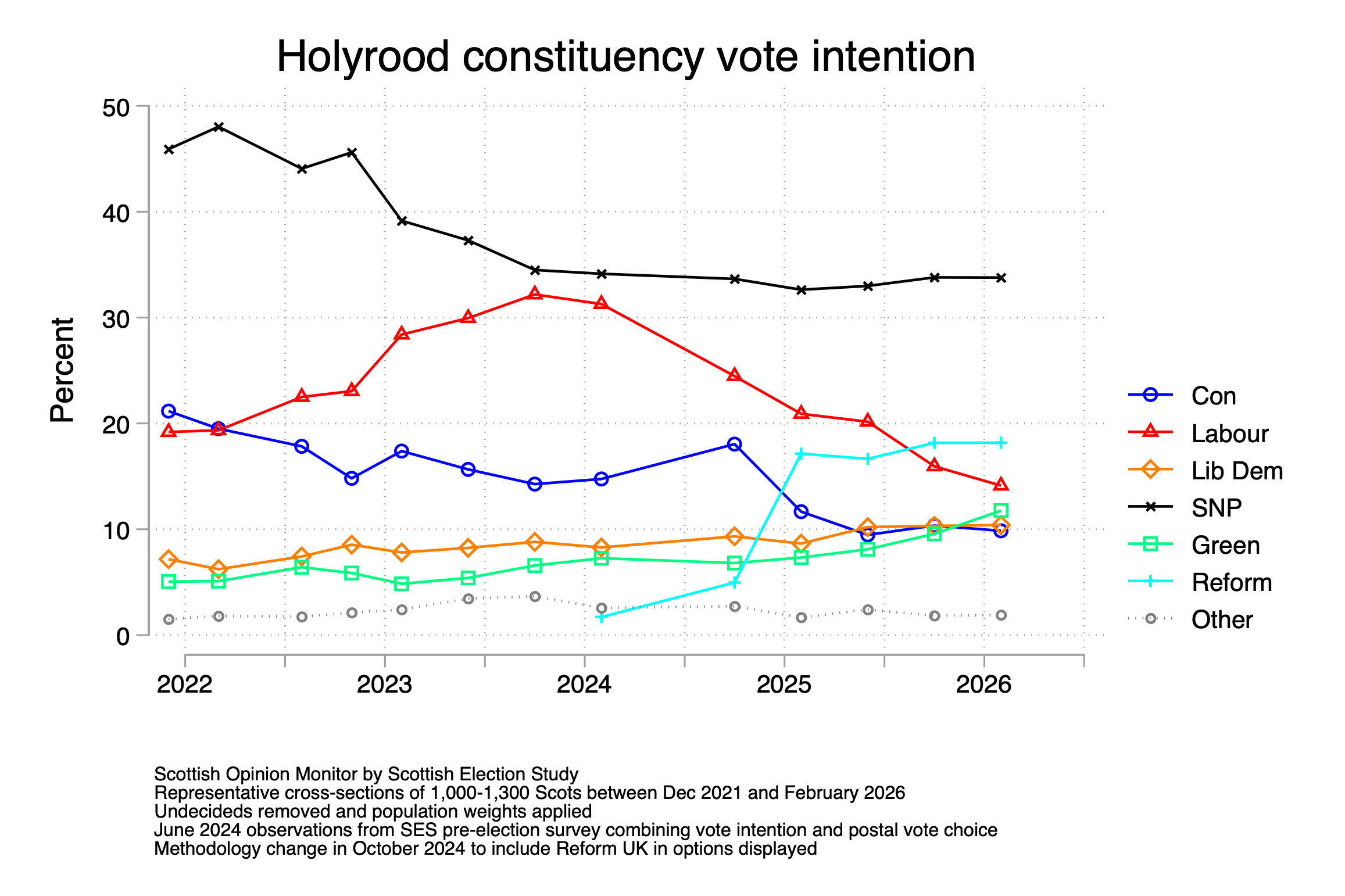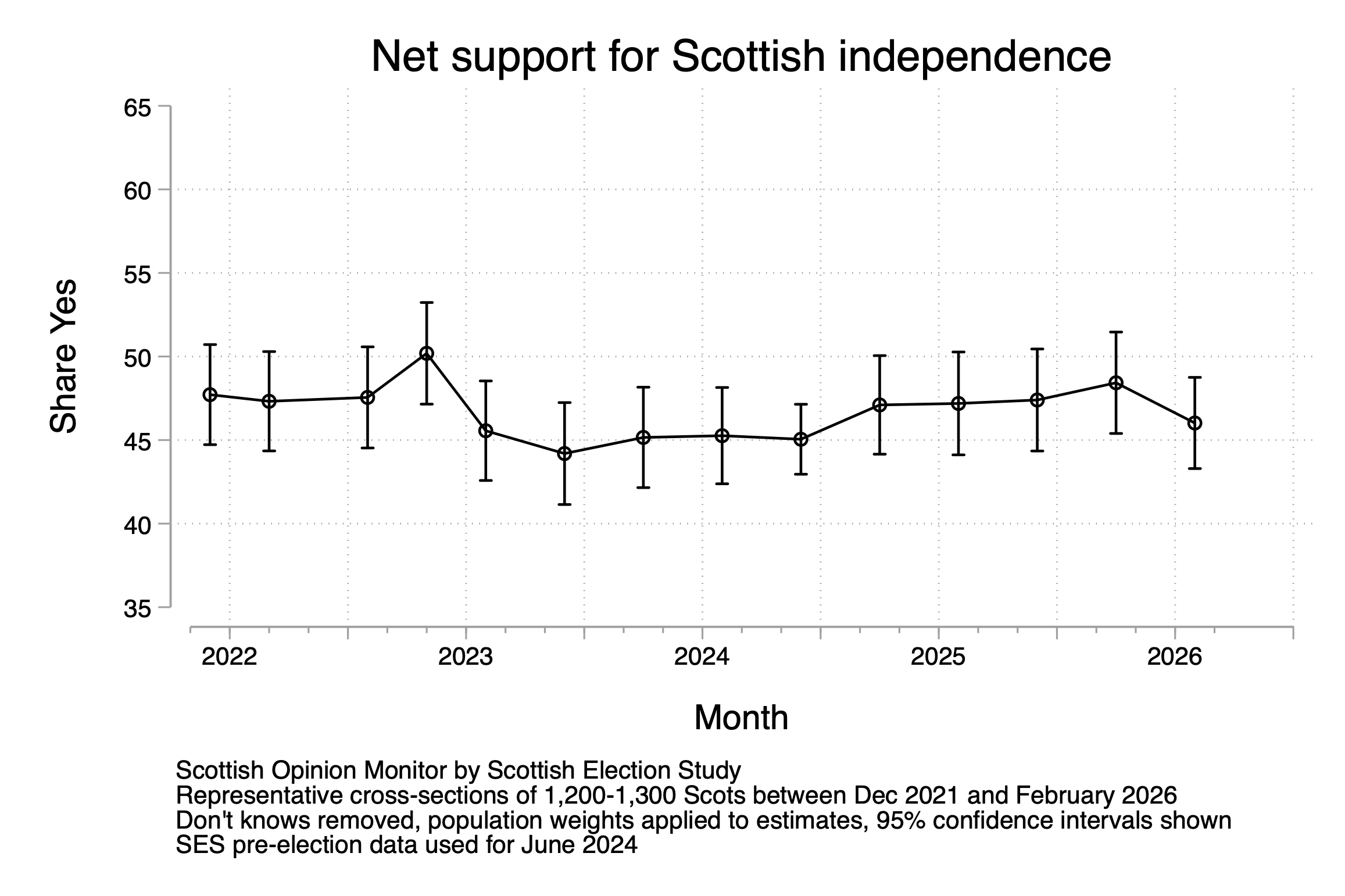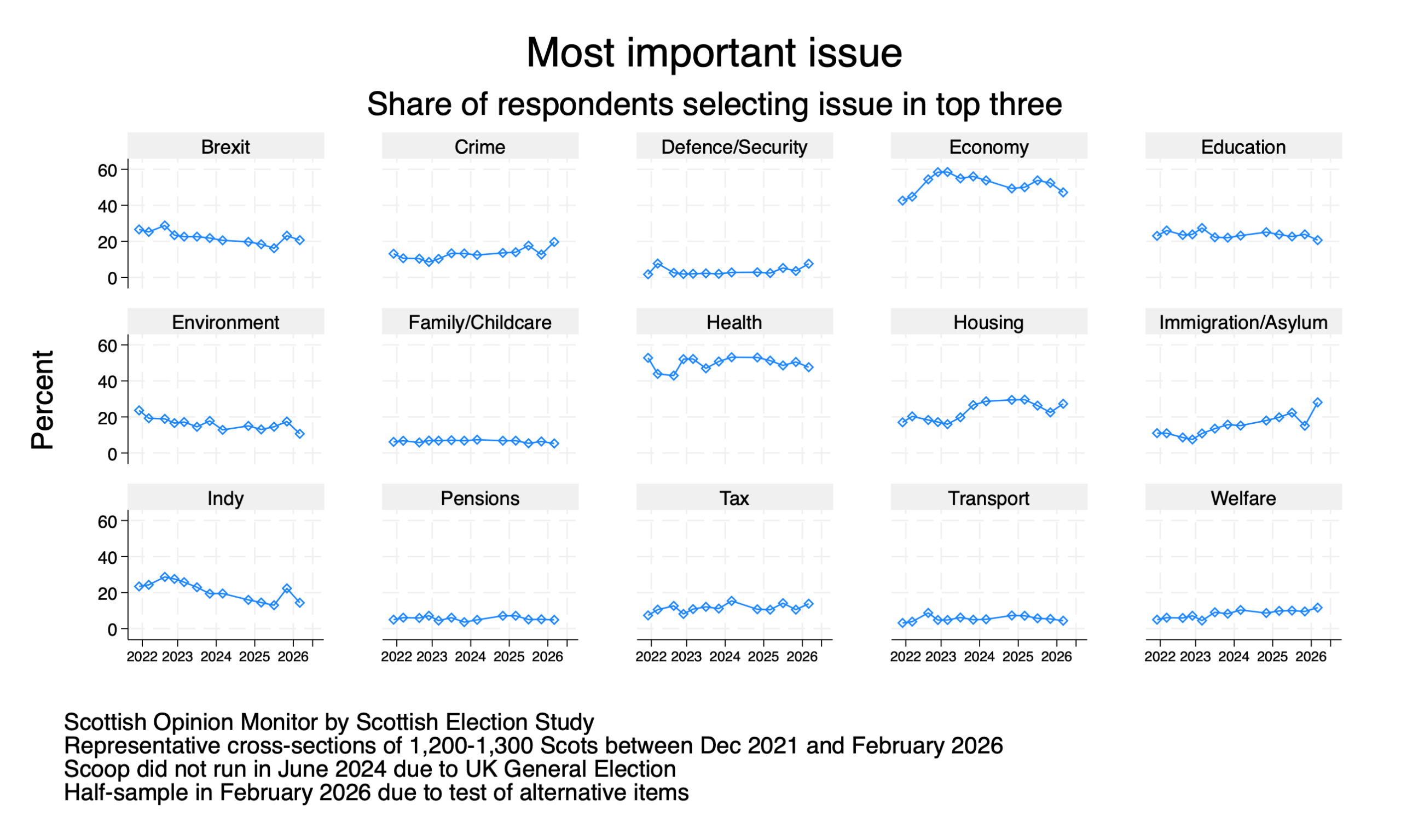 Key time-series visualisations from our triannual Scottish Opinion Monitor (Scoop) poll, updated immediately after fieldwork.