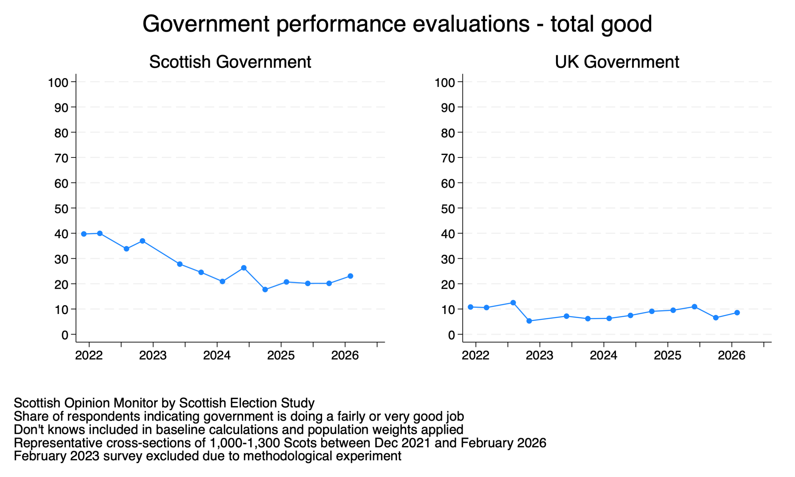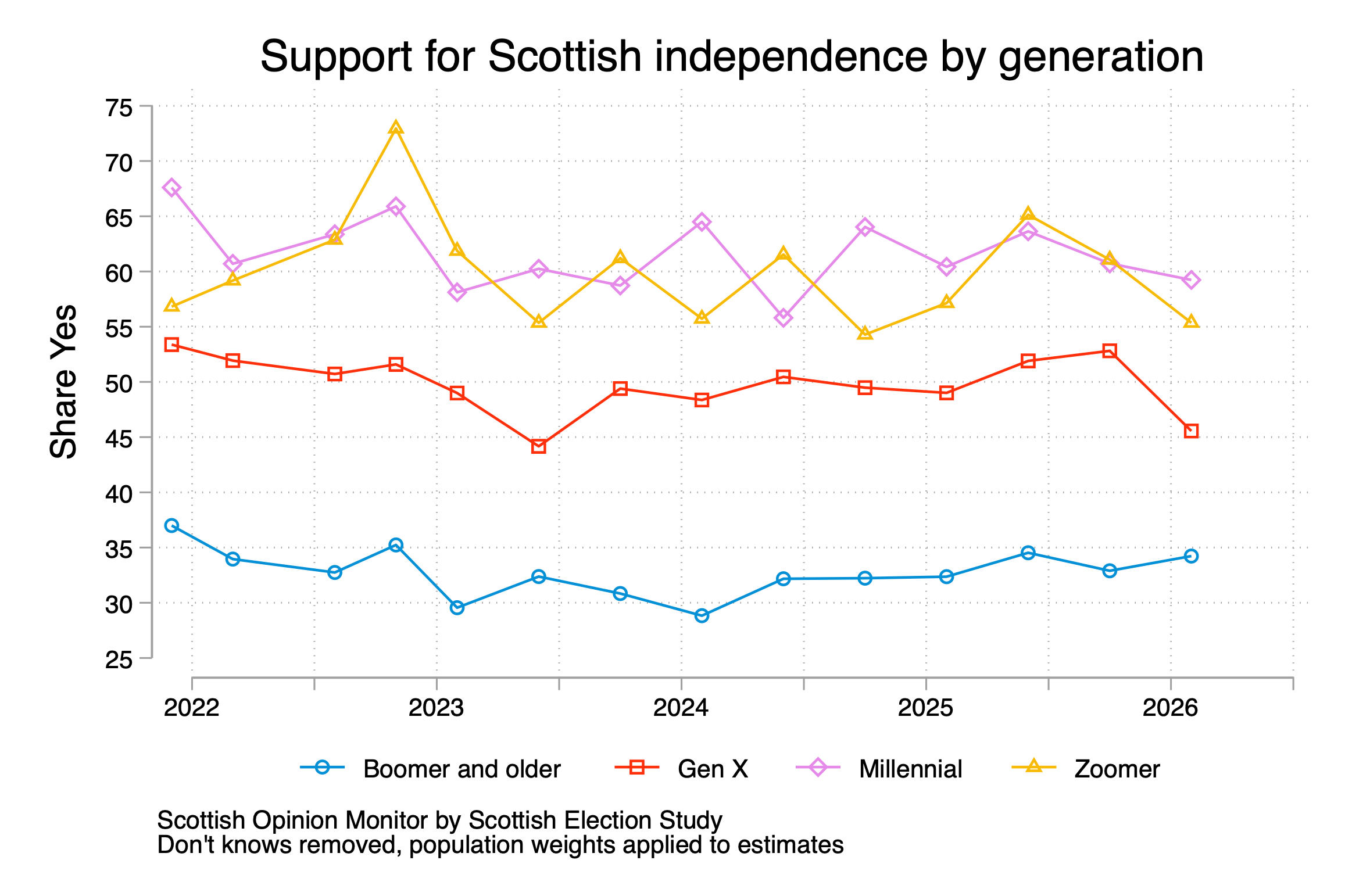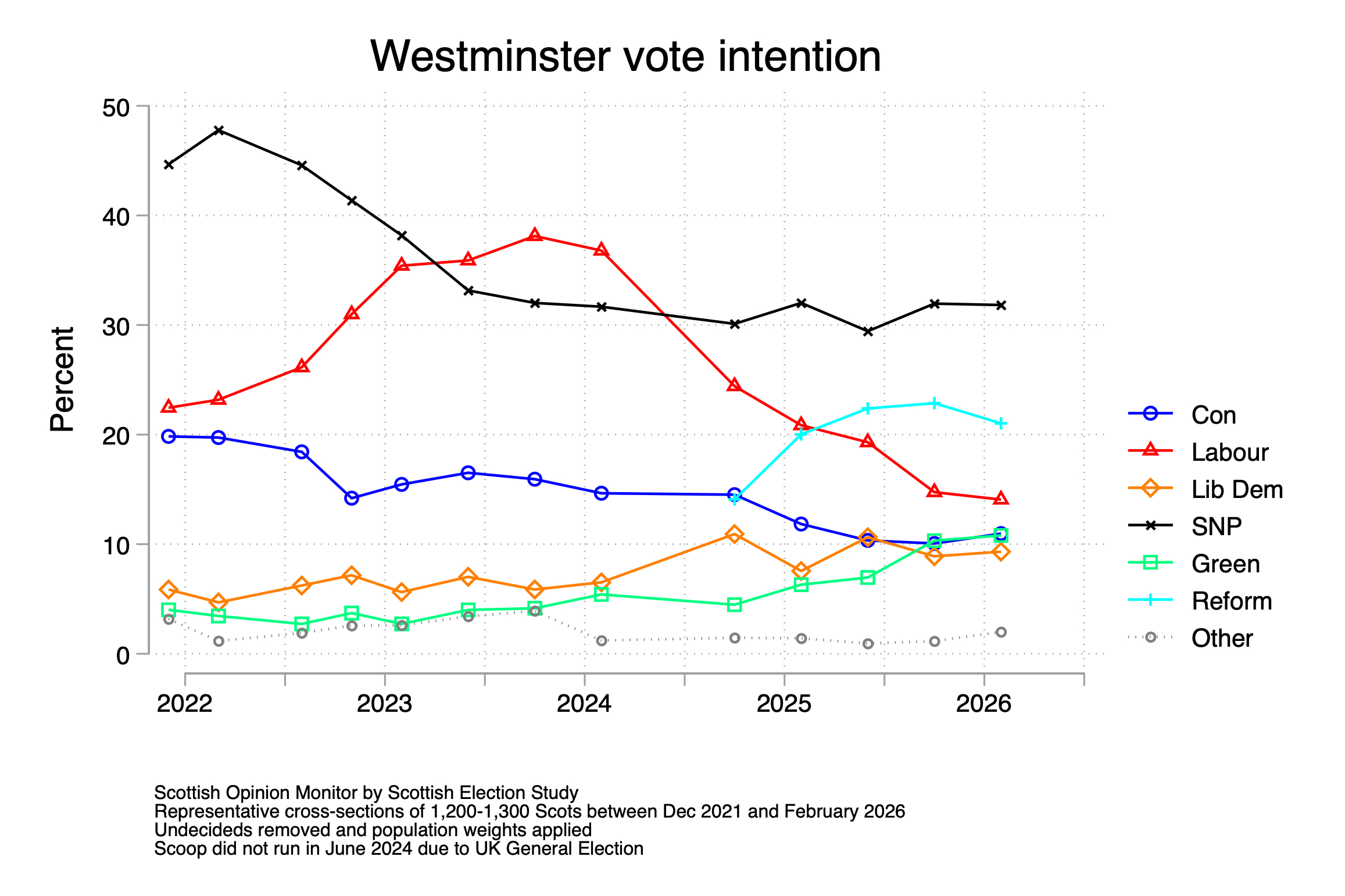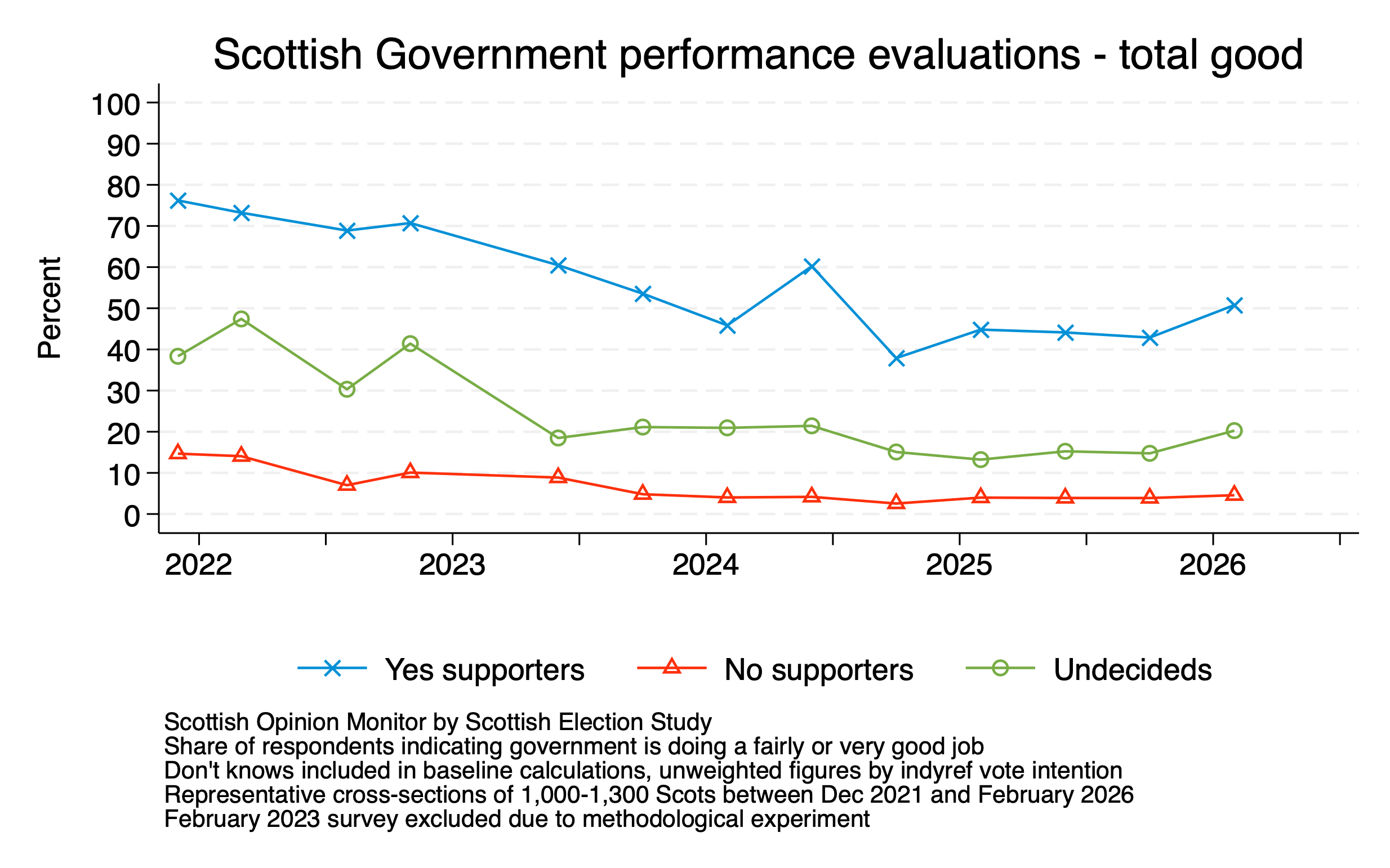 Key time-series visualisations from our triannual Scottish Opinion Monitor (Scoop) poll, updated immediately after fieldwork.